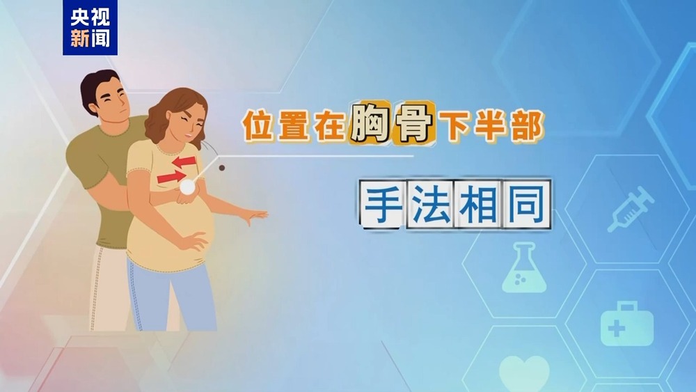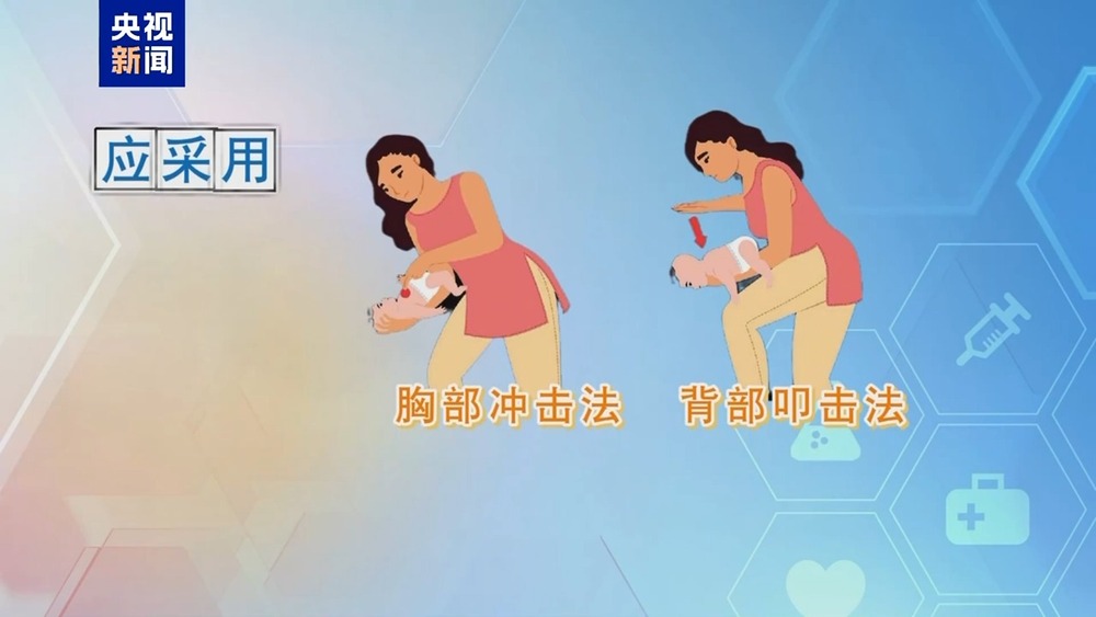 北京急救中心培训中心主任 陈志:对于小婴儿来说我们用“三明治”的手法,把婴儿抱起来,把他头冲下,用大鱼际拍击他的两个肩胛中间位置,一秒一次快速拍击,一共拍5次,翻过来以后,再用两个手指在两连线次冲击式按压,一秒一次,反复操作,直到异物冲出为止。